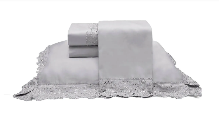 Com dobra feita e aplicação de renda bordada é um conjunto de peças de alta qualidade e elegância para a decoração do seu quarto. A dobra feita é um detalhe especial no lençol de cima, que dá um toque de sofisticação ao conjunto. A delicadeza da renda bordada se destaca e confere um charme a mais nas peças. Os produtos são produzidos em percal 300 fios e proporcionam um agradável toque acetinado, sinônimo da maciez e conforto que você procura.